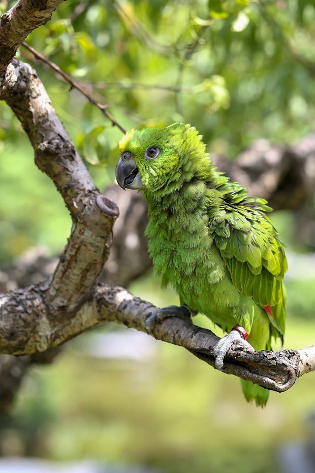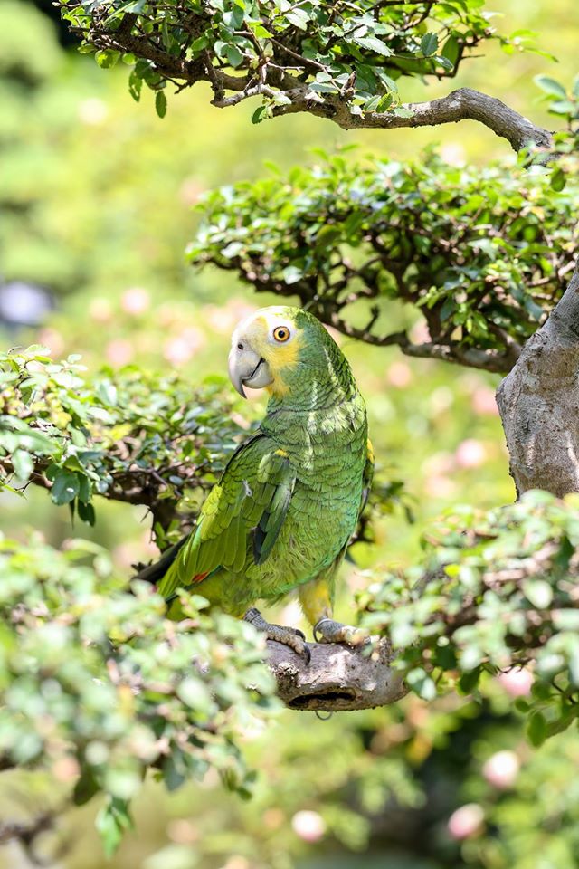 Vẹt xanh tạo dáng giữa tán bonsai cổ