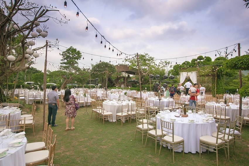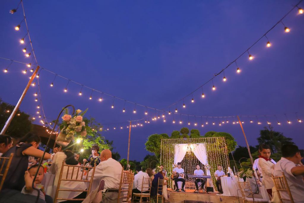 Tiệc tối bắt đầu từ cuối giờ chiều tới đêm khuya lung linh dưới những ánh đèn như ngàn sao, giữa không gian sân vườn mát mẻ quả là lý tưởng trong tiết trời hè thu.